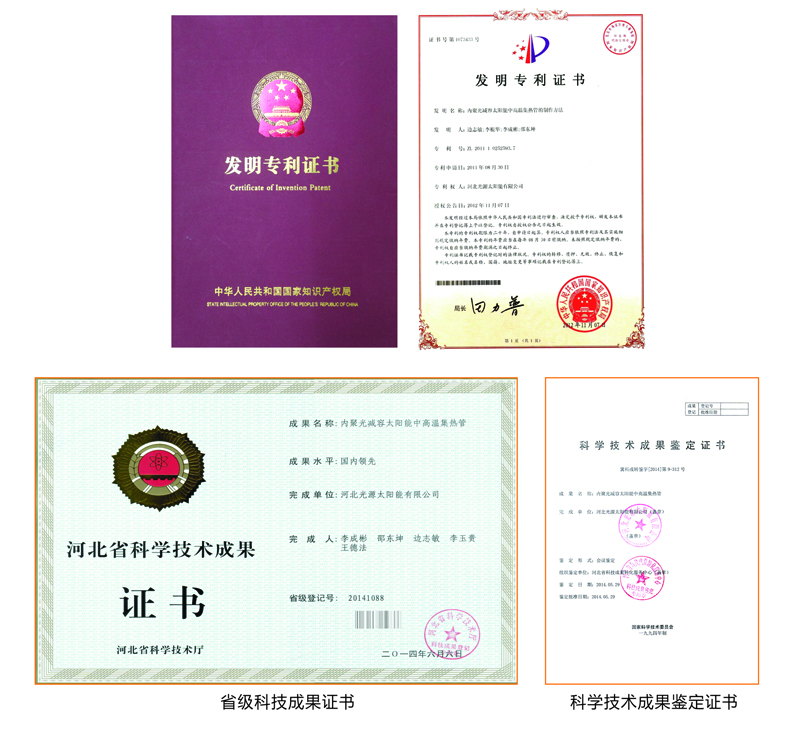 技術(shù)特點(diǎn):一是內(nèi)置CPC反射器。外罩玻璃管與吸熱管采用同軸套管,在真空管內(nèi)壁下半周設(shè)置金屬拋物面反射器,運(yùn)用拋物面原理實(shí)現(xiàn)了全角度采光,反射器不受大氣污染,聚光效果更好。二是耐高溫鍍膜技術(shù)。內(nèi)吸熱管表面濺射耐高溫太陽吸收膜層,內(nèi)外管之間抽真空,工作溫度400℃以上膜層不脫落、不老化。三是強(qiáng)制傳質(zhì)傳熱技術(shù)。在吸熱管內(nèi)插裝金屬套管,套管內(nèi)置入金屬導(dǎo)熱管,使管內(nèi)的介質(zhì)容量減少了70%,大大提高了傳質(zhì)傳熱效率。四是安全承壓技術(shù)。金屬套管與聯(lián)集箱采用絲扣連接,保證系統(tǒng)工作安全可靠。經(jīng)權(quán)威機(jī)構(gòu)檢驗(yàn),太陽能吸收比、熱損系數(shù)、真空品質(zhì)等技術(shù)指標(biāo)均優(yōu)于國家標(biāo)準(zhǔn)。采用該產(chǎn)品組成的太陽能中高溫?zé)崂孟到y(tǒng),穩(wěn)定工作溫度可達(dá)到163℃蒸汽,真正實(shí)現(xiàn)了太陽能由“熱水應(yīng)用”到“熱能應(yīng)用”的跨越式提升,填補(bǔ)了國內(nèi)太陽能中高溫真空集熱管在160℃溫區(qū)的技術(shù)空白。科技成果鑒定認(rèn)為:該產(chǎn)品的綜合性能達(dá)到了“國內(nèi)領(lǐng)先水平”,系統(tǒng)可廣泛用于太陽能飲用開水、采暖制冷、食品加工、紡織印染、農(nóng)副產(chǎn)品烘干等多種行業(yè)。對促進(jìn)大氣污染治理,推動我國能源結(jié)構(gòu)調(diào)整具有重要意義。