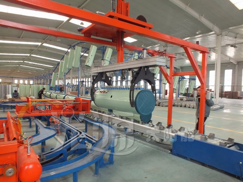 該生產(chǎn)線水箱發(fā)泡采用臥式無氟高壓定量一次發(fā)泡工藝,是國內(nèi)第一家,也是目前國內(nèi)最先進(jìn)的發(fā)泡線;內(nèi)外桶組裝完成后由機(jī)械手自動抓取,放到工藝小車上,發(fā)泡完成后也由機(jī)械手來完成水箱的下件工作,減輕了工人的勞動強(qiáng)度,減少了搬運(yùn)過程中的磕碰等現(xiàn)象;發(fā)泡完成后水箱由錐滾線和升降機(jī)自動運(yùn)送到地下室,屬首家采用地下室恒溫保溫工藝,節(jié)約能源,保證生產(chǎn)出的水箱具有穩(wěn)定的質(zhì)量。