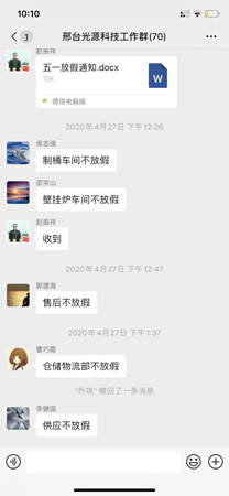 “五.一”前的4月27日,光源太陽能科技公司下發(fā)了“五.一”放假的通知。通知說:“經(jīng)公司領(lǐng)導(dǎo)研究決定,自2020年5月1日——2020年5月5日(“五.一”國際勞動節(jié))放假五天?!?/span>