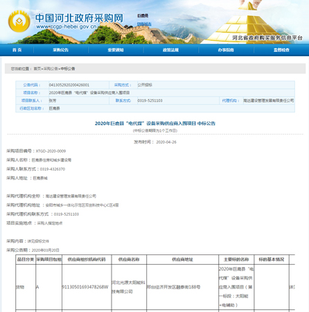 2020年巨鹿縣“電代煤”設(shè)備采購供應(yīng)商入圍項目