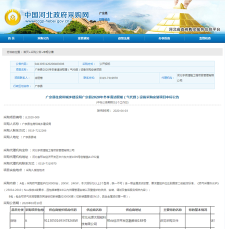 廣宗縣2020年冬季清潔取暖(氣代煤)設(shè)備采購安裝項目中標