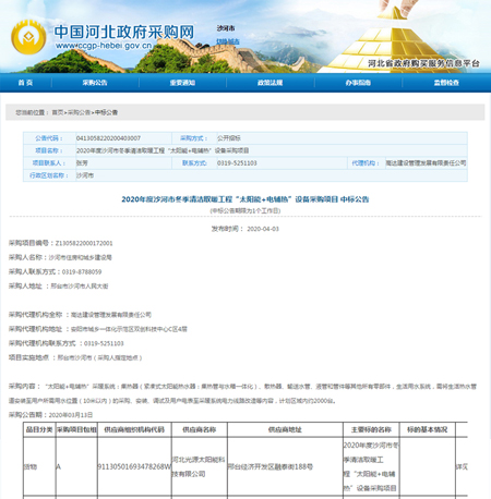 2020年度沙河市“太陽能+電輔熱”設(shè)備采購項目中標